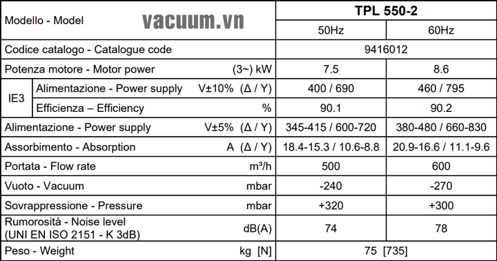 - Máy thổi khí chân không DVP TPL 550-2 sử dụng động cơ: 7.5 kW điện áp 380V/50Hz/3ph, độ ồn tối đa: 74 dB(A).