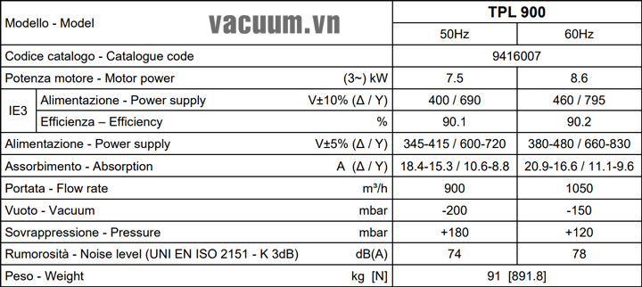 - Máy thổi khí chân không DVP TPL 900 sử dụng động cơ: 7.5 kW điện áp 380V/50Hz/3ph, độ ồn tối đa: 74 dB(A).