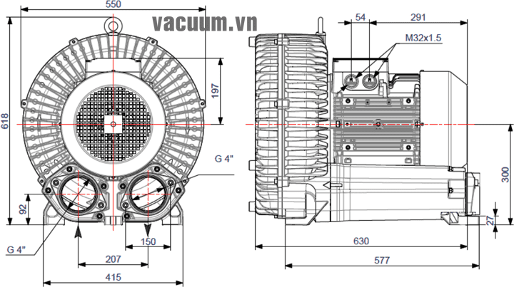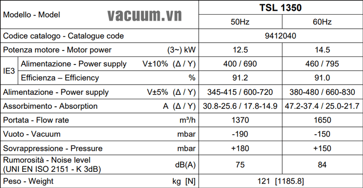- Máy thổi khí chân không DVP TSL 1350 sử dụng động cơ: 12.5 kW điện áp 380V/50Hz/3ph, độ ồn tối đa: 75 dB(A).
