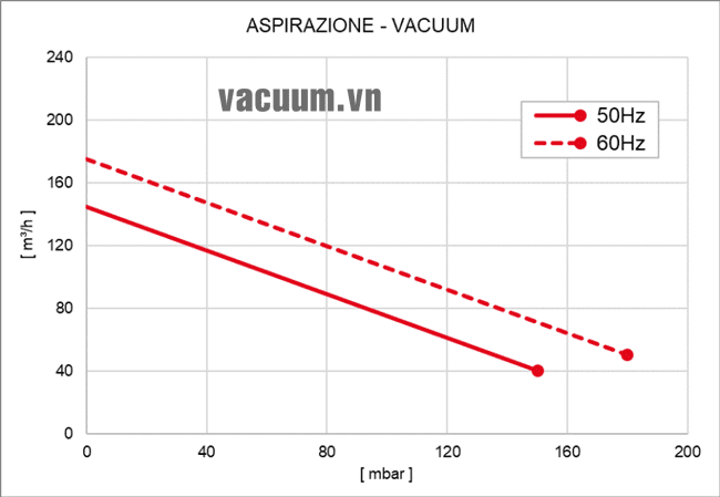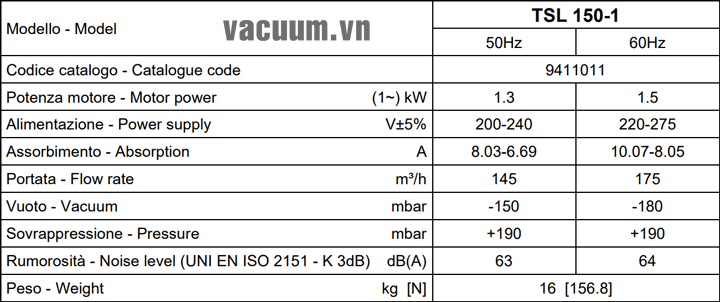 - Máy thổi khí chân không DVP TSL 150-1 sử dụng động cơ: 1.3 kW điện áp 230V/50Hz/1ph, độ ồn tối đa: 63 dB(A).