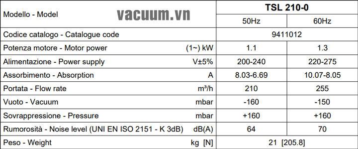 - Máy thổi khí chân không DVP TSL 210-0 sử dụng động cơ: 1.3 kW điện áp 380V/50Hz/3ph, độ ồn tối đa: 64 dB(A).