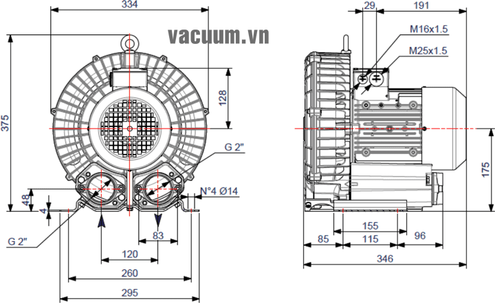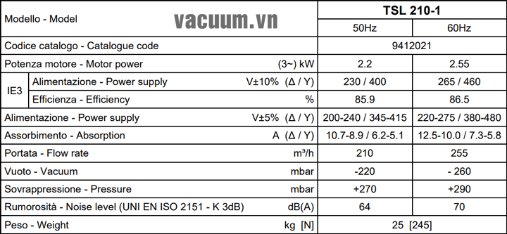 - Máy thổi khí chân không DVP TSL 210-1 sử dụng động cơ: 2.2 kW điện áp 380V/50Hz/3ph, độ ồn tối đa: 64 dB(A).
