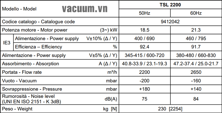 - Máy thổi khí chân không DVP TSL 2200 sử dụng động cơ: 18.5 kW điện áp 380V/50Hz/3ph, độ ồn tối đa: 75 dB(A).