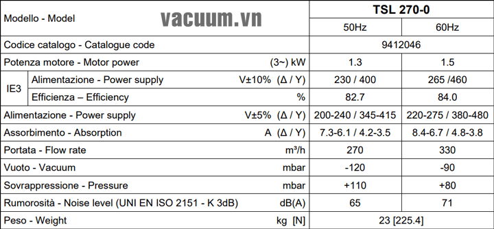 - Máy thổi khí chân không DVP TSL 270-0 sử dụng động cơ: 1.3 kW điện áp 380V/50Hz/3ph, độ ồn tối đa: 65 dB(A).