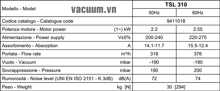 - Máy thổi khí chân không DVP TSL 310 sử dụng động cơ: 2.2 kW điện áp 380V/50Hz/3ph, độ ồn tối đa: 69 dB(A).
