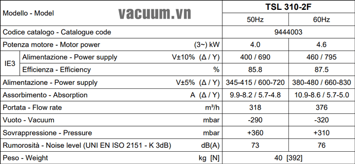 - Máy thổi khí chân không DVP TSL 310-2F sử dụng động cơ: 4 kW điện áp 380V/50Hz/3ph, độ ồn tối đa: 73 dB(A).