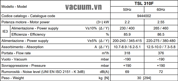 - Máy thổi khí chân không DVP TSL 310F sử dụng động cơ: 2.2 kW điện áp 380V/50Hz/3ph, độ ồn tối đa: 69 dB(A).