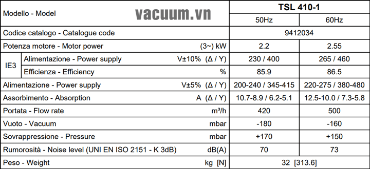 - Máy thổi khí chân không DVP TSL 410-1 sử dụng động cơ: 2.2 kW điện áp 380V/50Hz/3ph, độ ồn tối đa: 70 dB(A).