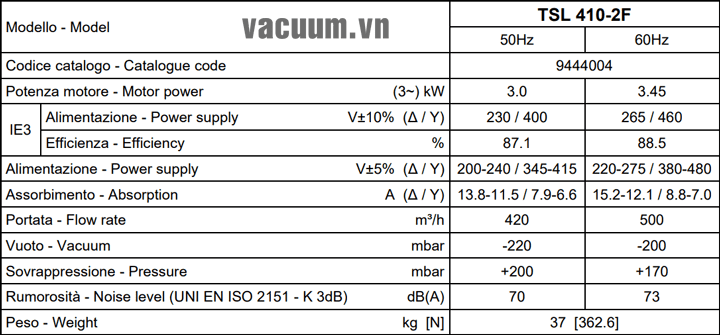 - Máy thổi khí chân không DVP TSL 410-2F sử dụng động cơ: 3.0 kW điện áp 380V/50Hz/3ph, độ ồn tối đa: 70 dB(A).
