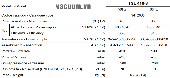- Máy thổi khí chân không DVP TSL 410-3 sử dụng động cơ: 4 kW điện áp 380V/50Hz/3ph, độ ồn tối đa: 70 dB(A).