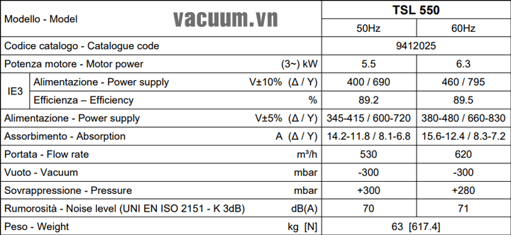 - Máy thổi khí chân không DVP TSL 550 sử dụng động cơ: 5.5 kW điện áp 380V/50Hz/3ph, độ ồn tối đa: 70 dB(A).