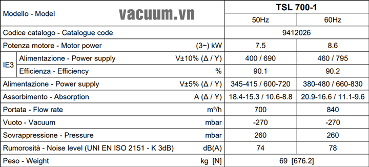 - Máy thổi khí chân không DVP TSL 700-1 sử dụng động cơ: 7.5 kW điện áp 380V/50Hz/3ph, độ ồn tối đa: 74 dB(A).