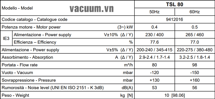 - Máy thổi khí chân không DVP TSL 80 sử dụng động cơ: 0.4 kW điện áp 380V/50Hz/3ph, độ ồn tối đa: 53 dB(A).
