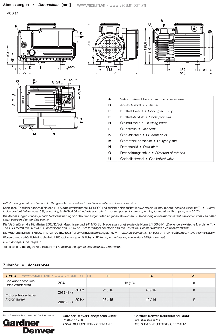 - Bơm chân không Elmo Rietschle V-VGD 16 có độ ồn max: 65 dB(A), sử dụng động cơ: 0.55 kW, điện áp 230V/50-60Hz/1ph, cấp bảo vệ IP54, tiêu chuẩn DIN EN 60034, tốc độ vòng quay động cơ: 3.000 vòng/phút.