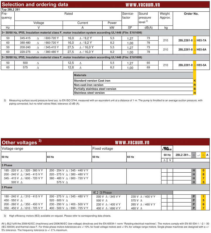 - Sử dụng động cơ: 5.5 kW, điện áp 200 - 415V/50-60Hz/3ph, động cơ IE2, tiêu chuẩn DIN EN 60034, cấp bảo vệ IP 55.