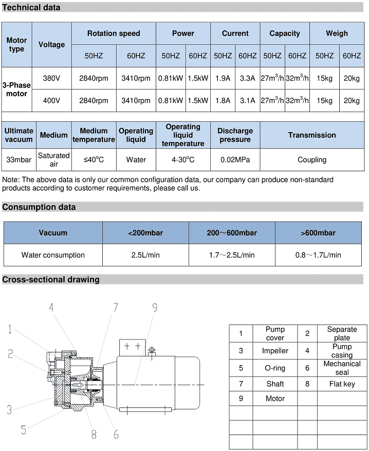 - Bơm chân không vòng nước EVP 2BV2-060 sử dụng động cơ: 0.81 kW, điện áp 230 - 400V/50-60Hz/3ph, động cơ IE2, tiêu chuẩn DIN EN 60034, tốc độ động cơ: 2.840 rpm, cấp bảo vệ IP 55.