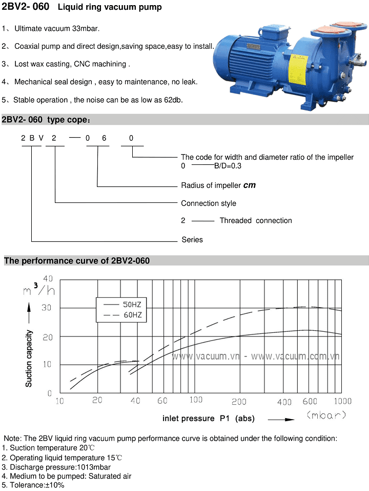 - Bơm chân không vòng nước EVP 2BV2-060, EVP liquid ring vacuum pump 2BV2-060: thuộc dạng bơm hút chân không vòng nước (Liquid vacuum pump), 1 cấp, có lưu lượng: 27 m3h, độ chân không đạt: 25 torr (33 mbar), lượng nước tiêu thụ: 0.8 - 2.5 lít/phút, chuyên dùng để hút chân không trong công nghiệp.