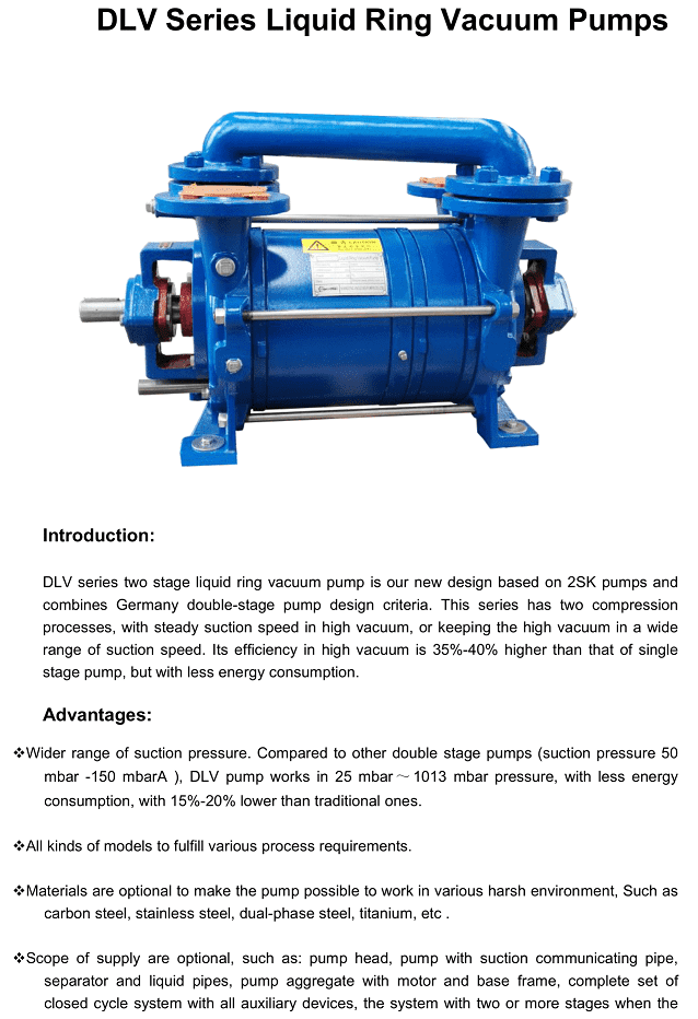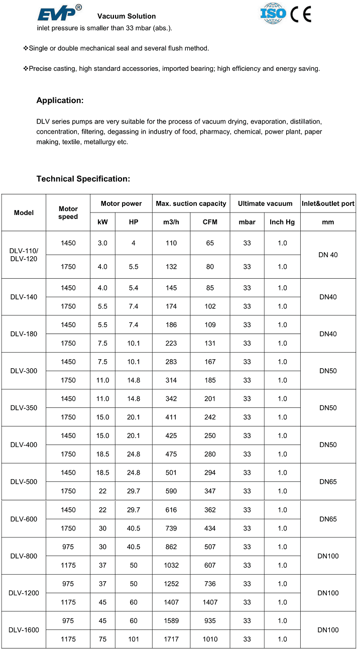 - Bơm chân không vòng nước EVP DLV-600, EVP liquid ring vacuum pump DLV-600: thuộc dạng bơm hút chân không vòng nước (Liquid vacuum pump), 2 cấp, có lưu lượng: 616 m3/h, độ chân không đạt 33 mbar, chuyên dùng để hút chân không trong công nghiệp.