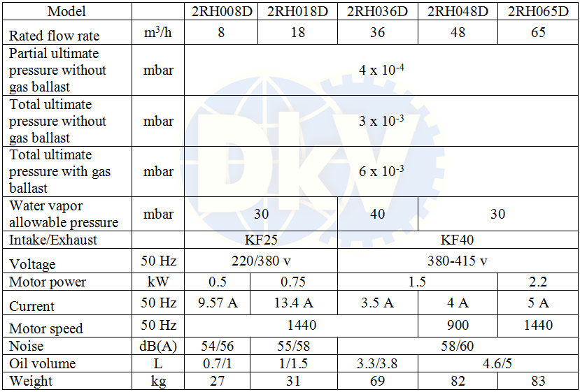 - Bơm chân không Hokaido 2RH036D có độ ồn max: 54 dB(A). Sử dụng động cơ: 1.5 kW, điện áp 230V/50Hz/1ph hoặc 380-400V/50Hz/3ph tiêu chuẩn DIN EN 60034, tốc độ vòng quay động cơ:1.440 vòng/phút.