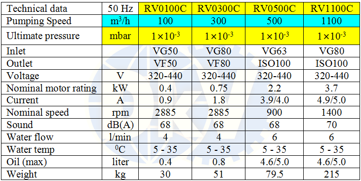 - Bơm tăng áp chân không Hokaido RV0300C có độ ồn trung bình: 68 dB(A), sử dụng động cơ 3 phase 0.75 kW/380 - 400 V/50Hz/3ph (cấp bảo vệ IP54.ISO F), tốc độ vòng quay động cơ: 2885 rpm. Size cổ hút/cổ xả: VG80 | VF80. Dung tích dầu bôi trơn: 0.8 lít.
