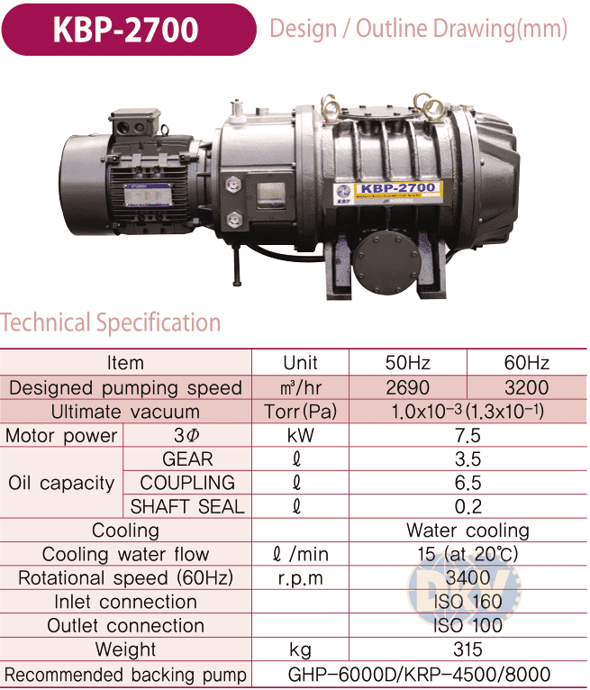 - Bơm tăng áp chân không Kodivac KBP-2700, Kodivac roots booster pump KBP-2700: là loại bơm tăng áp cỡ lớn, lưu lượng max: 2690 m3/h, phổ dụng trong công nghiệp. Bơm tăng áp chân không Kodivac KBP-2700 có độ chân không max: 1x10-3 torr | 1.3x10-3 mbar.