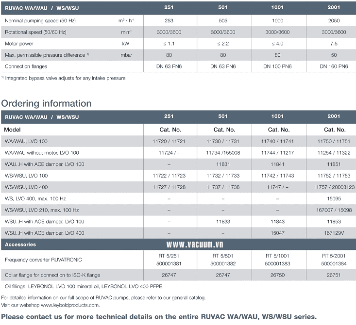 - Bơm tăng áp chân không Leybold RUVAC WA 1001, Leybold roots booster pump RUVAC WA 1001 là loại bơm tăng áp cỡ lớn, lưu lượng max: 1000 m3/h, phổ dụng trong công nghiệp. Bơm tăng áp chân không Leybold RUVAC WA 1001 có độ chân không max: 80 mbar.