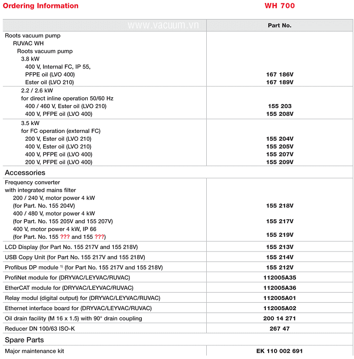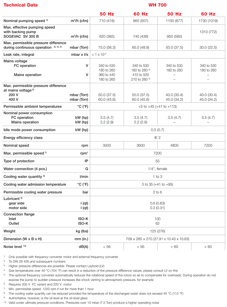 - Bơm tăng áp chân không Leybold RUVAC WH 700, Leybold roots booster pump RUVAC WH 700 là loại bơm tăng áp cỡ lớn, lưu lượng max: 710 - 1.150 m3/h, phổ dụng trong công nghiệp. Bơm tăng áp chân không Leybold RUVAC WH 700 có độ chân không max: 50 - 75 mbar.