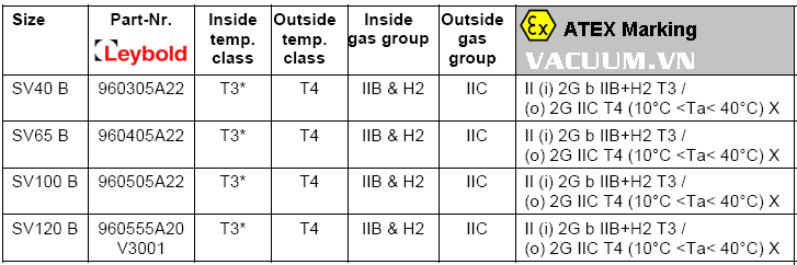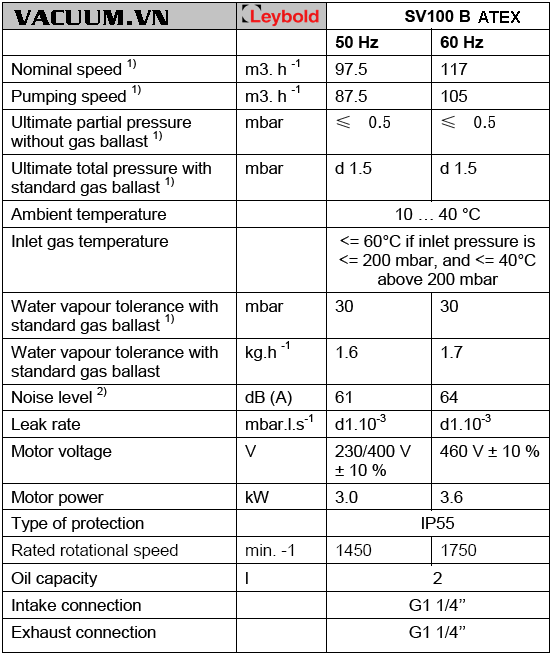 - Bơm chân không chống cháy nổ Leybold SOGEVAC SV 100 B - ATEX có độ ồn max: 60 dB(A), sử dụng động cơ phòng cháy nổ: 3 kW/ 380-400V/50Hz/3ph (tiêu chuẩn IIB + H2 hoặc tiêu chuẩn IIA), tốc độ quay động cơ: 1.450 rpm, cấp bảo vệ IP 55-F.