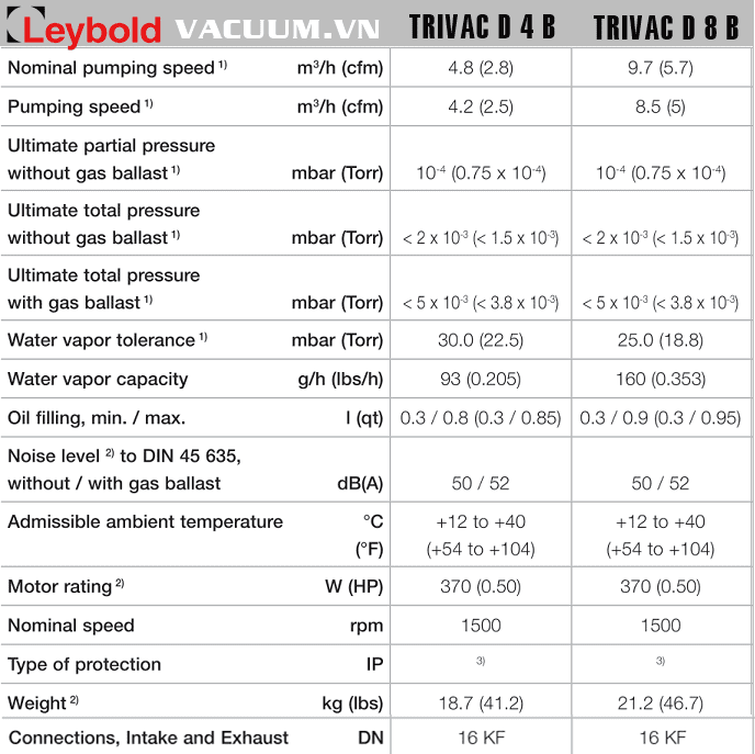 - Bơm chân không chống cháy nổ Leybold TRIVAC D 8 B - ATEX, bơm hút chân không phòng chống cháy nổ Leybold TRIVAC D 8 B - ATEX, Leybold vacuum oil sealed vacuum pumps TRIVAC D 8 B - ATEX (code: 140150) là loại bơm chân không chống cháy nổ vòng dầu 2 cấp, cỡ nhỏ, có lưu lượng: 8.5 m3/h, độ chân không đạt < 2.10-3mbar.(khi đóng chấn lưu khí Gas Ballast), 5.10-3mbar (khi mở chấn lưu khí Gas Ballast), độ chân không tuyệt đối: 10-4mbar (khi đóng chân lưu khí Gas ballast).