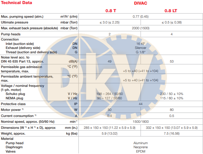 - Trọng lượng bơm chân không Leybold DIVAC 0.8 T : 5.9 kg.