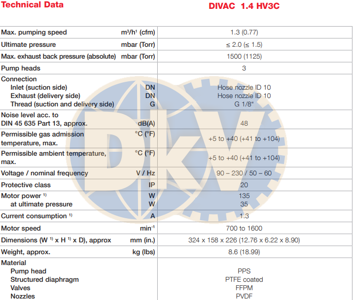 - Bơm chân không Leybold DIVAC 1.4 HV3C có công suất 135 W, điện áp 230V/50-60Hz/1ph, cấp bảo vệ IP 20, tốc độ vòng quay 700 - 1600 vòng/phút.