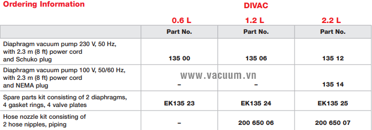 - Trọng lượng bơm chân không Leybold DIVAC 2.2 L : 12.6 kg.