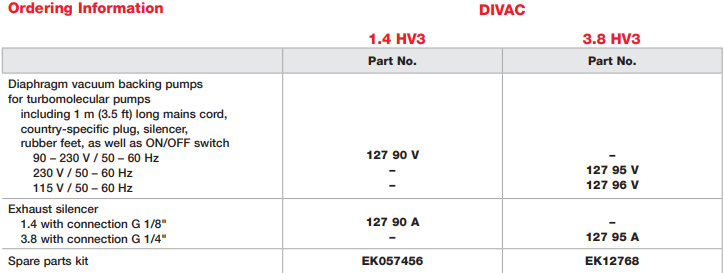 - Bơm chân không Leybold DIVAC 3.8 HV3 có công suất 250 W, điện áp 230V/50-60Hz/1ph, cấp bảo vệ IP 20, tốc độ vòng quay 1.500 - 1.800 vòng/phút.