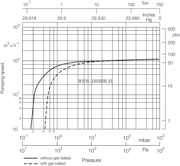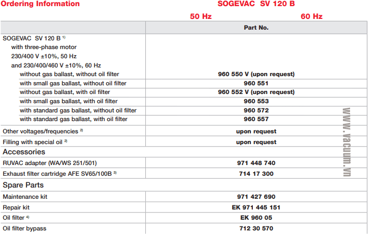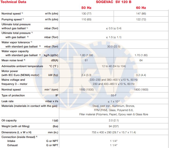 - Bơm chân không Leybold SOGEVAC SV 120 B sử dụng động cơ 2.4 kW/380-400V/50Hz/3ph, tốc độ vòng quay động cơ max: 1.500 vòng/phút, độ ồn max: 61 dB(A).