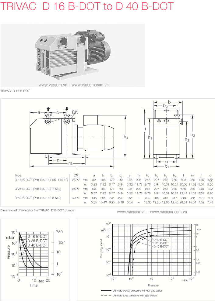 - Bơm chân không Leybold TRIVAC D 16 B DOT, bơm hút chân không Leybold TRIVAC D 16 B DOT, Leybold vacuum oil sealed vacuum pumps TRIVAC D 16 B DOT là loại bơm chân không vòng dầu 2 cấp, cỡ nhỏ, có lưu lượng max: 16.5 m3/h, độ chân không đạt < 0.6 mbar.(khi đóng chấn lưu khí Gas Ballast), 0.9 mbar (khi mở chấn lưu khí Gas Ballast).