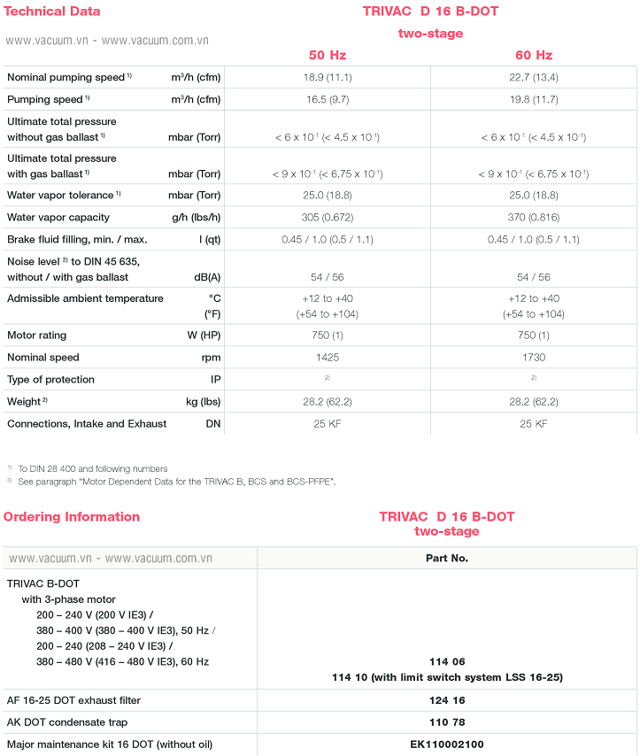 - Bơm chân không Leybold TRIVAC D 16 B DOT sử dụng động cơ: 0.75 kW/380V/50Hz/3ph cấp bảo vệ IP 54/55, tốc độ vòng quay động cơ max: 1.425 vòng/phút, độ ồn max: 54 dB(A)