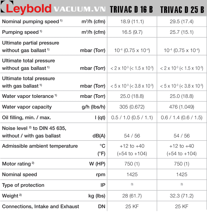 - Bơm chân không Leybold TRIVAC D 25 B sử dụng động cơ 750W/220V/50-60Hz/1ph hoặc 380V/50-60Hz/3ph cấp bảo vệ IP 55, tốc độ vòng quay động cơ max: 1.425 - 1.730 vòng/phút, độ ồn max: 54/56 dB(A).