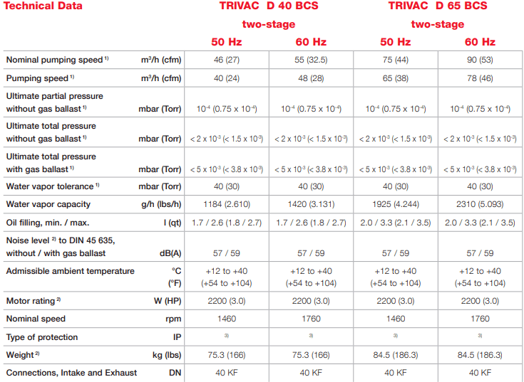 - Bơm chân không Leybold TRIVAC D 40 BCS sử dụng động cơ 2.2 kW (3 HP) điện áp 380V/50-60Hz/3ph cấp bảo vệ IP 55, tốc độ vòng quay động cơ max: 1.460 vòng/phút.