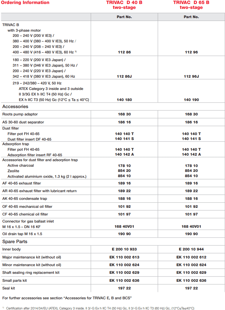 - Bơm chân không Leybold TRIVAC D 65 B, bơm hút chân không Leybold TRIVAC D 65 B, Leybold vacuum oil sealed vacuum pumps TRIVAC D 65 B là loại bơm chân không vòng dầu 2 cấp, cỡ nhỏ, có lưu lượng: 65 m3/h, độ chân không đạt < 2.10-3mbar.(khi đóng chấn lưu khí Gas Ballast), 5.10-3mbar (khi mở chấn lưu khí Gas Ballast), độ chân không tuyệt đối: 10-4mbar (khi đóng chân lưu khí Gas ballast).