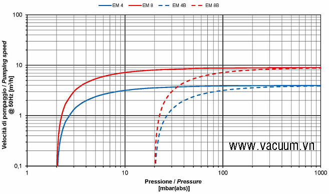 - Bơm chân không PVR EM 8 B có độ ồn max: 58 dB(A). Sử dụng động cơ: 0.25 kW, điện áp 230V/50Hz/1ph hoặc 400V/50-60Hz/3ph tiêu chuẩn DIN EN 60034, tốc độ vòng quay động cơ: 3.000 vòng/phút.