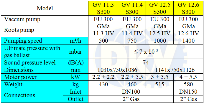 - Bản chất bơm chân không tăng áp GV 11.3 S300 là sự ghép đôi của bơm chân không vòng dầu, 1 cấp, PVR EU 300 (290 m3/h, 0.5 mbar, 2.2 kW/380V/50Hz/3ph, làm mát bằng nước) làm bơm thứ cấp với bơm tăng áp chân không PVR GMa 11.3 HV (500 m3/h, 140 mbar, 2.2 kW/380V/50Hz/3ph, làm mát bằng không khí tự nhiên) làm bơm sơ cấp.