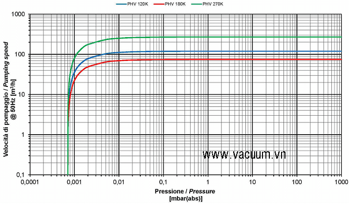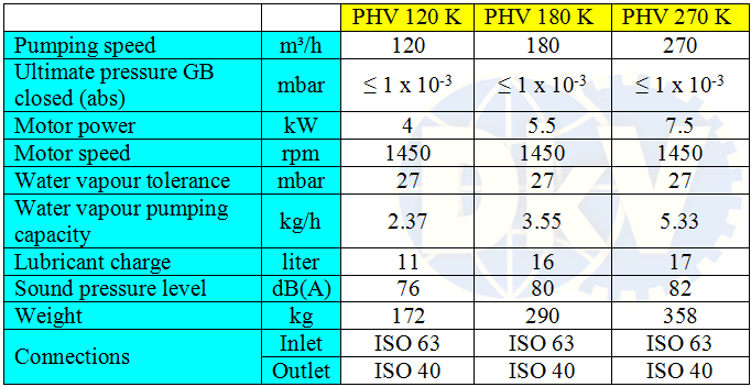 - Bơm chân không PVR PHV 180 K, PVR dual stage oil rotary vane Vacuum Pumps PHV 180 K thuộc dạng bơm hút chân không vòng dầu (oil-flooded), cánh gạt, 2 cấp, có lưu lượng: 180 m3/h, độ chân không 1x10-3 mbar (khi đóng chấn lưu khí Gas Ballast), độ chân không 7x10-3 mbar (khi mở chấn lưu khí Gas Ballast) chuyên dùng để hút chân không trong công nghiệp.