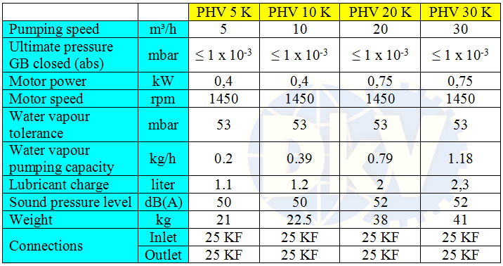 - Bơm chân không PVR PHV 5 K có khả năng chịu hơi nước: 53 mbar khi mở gas ballast. Độ thoát ngưng tụ hơi nước: 0.2 kg/h (khi mở gas ballast).