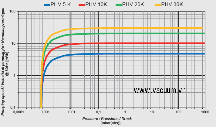 - Bơm chân không PVR PHV 5 K có độ ồn max: 50 dB(A). Sử dụng động cơ: 0.4 kW, điện áp 380-400V/50-60Hz/3ph tiêu chuẩn DIN EN 60034, tốc độ vòng quay động cơ:1.450 vòng/phút.