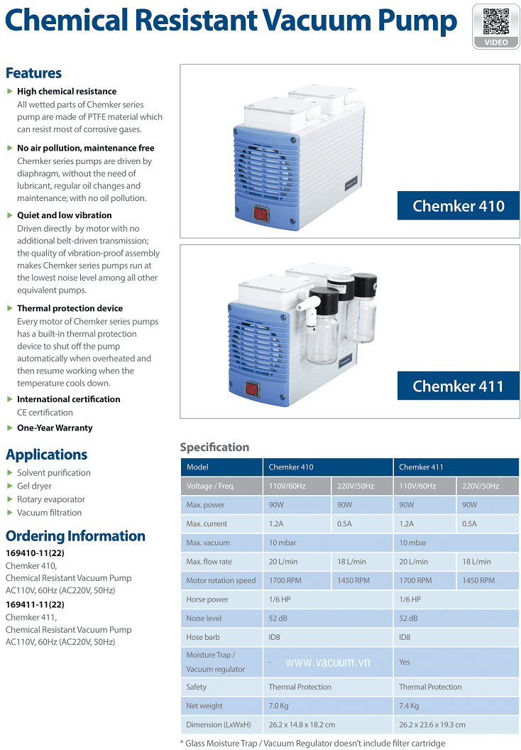 - Bơm chân không Rocker Chemker 411, Rocker oil free vacuum pump Chemker 411 thuộc dạng bơm hút chân không khô, không dầu (Dry oil free vacuum pump) có lưu lượng: 18 lít/phút (1.08 m3/h), độ chân không đạt 10 mbar chuyên dùng để hút chân không trong công nghiệp.