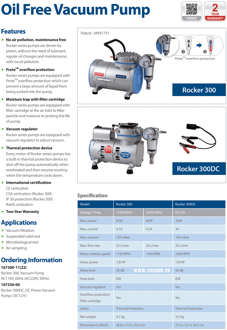 - Bơm chân không Rocker 300DC, Rocker oil free vacuum pump Rocker 300DC thuộc dạng bơm hút chân không khô, không dầu (Dry oil free vacuum pump) có lưu lượng: 25 lít/phút (1.5 m3/h), độ chân không đạt 145 mbar chuyên dùng để hút chân không trong công nghiệp.