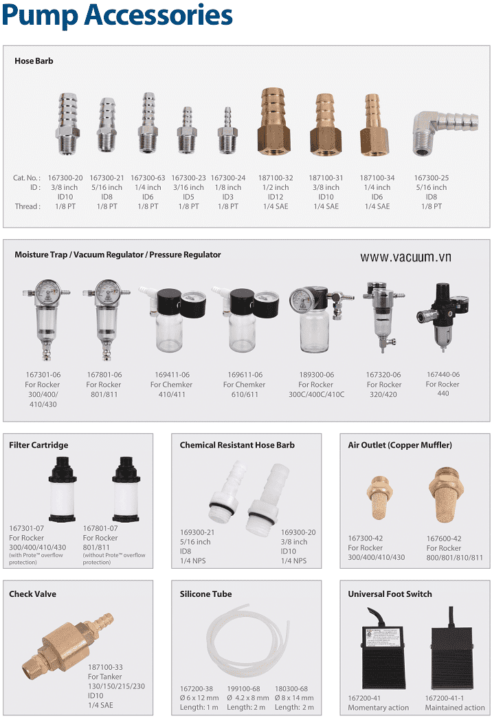 - Bơm chân không Rocker 300DC trang bị bộ điều áp FRL (lọc, chống tràn và đặt áp). Đầu kết nối các cút: ID8.