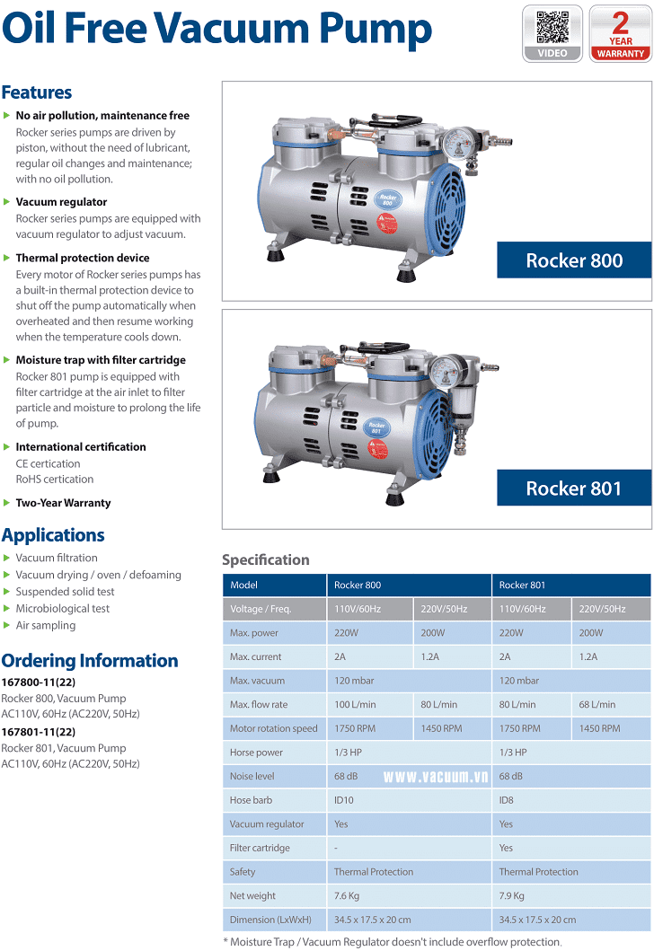 BƠM CHÂN KHÔNG ROCKER 800 | ROCKER OIL FREE VACUUM PUMP ROCKER 800