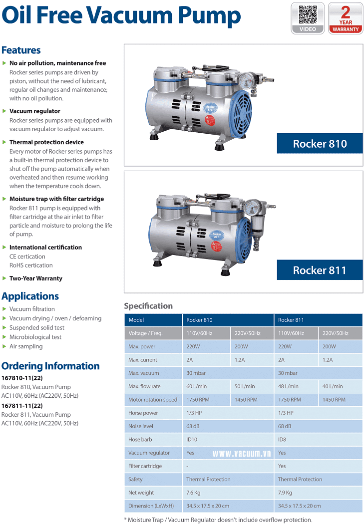 - Bơm chân không Rocker 811, Rocker oil free vacuum pump Rocker 811 thuộc dạng bơm hút chân không khô, không dầu (Dry oil free vacuum pump) có lưu lượng: 40 lít/phút (2.4 m3/h), độ chân không đạt 30 mbar chuyên dùng để hút chân không trong công nghiệp.