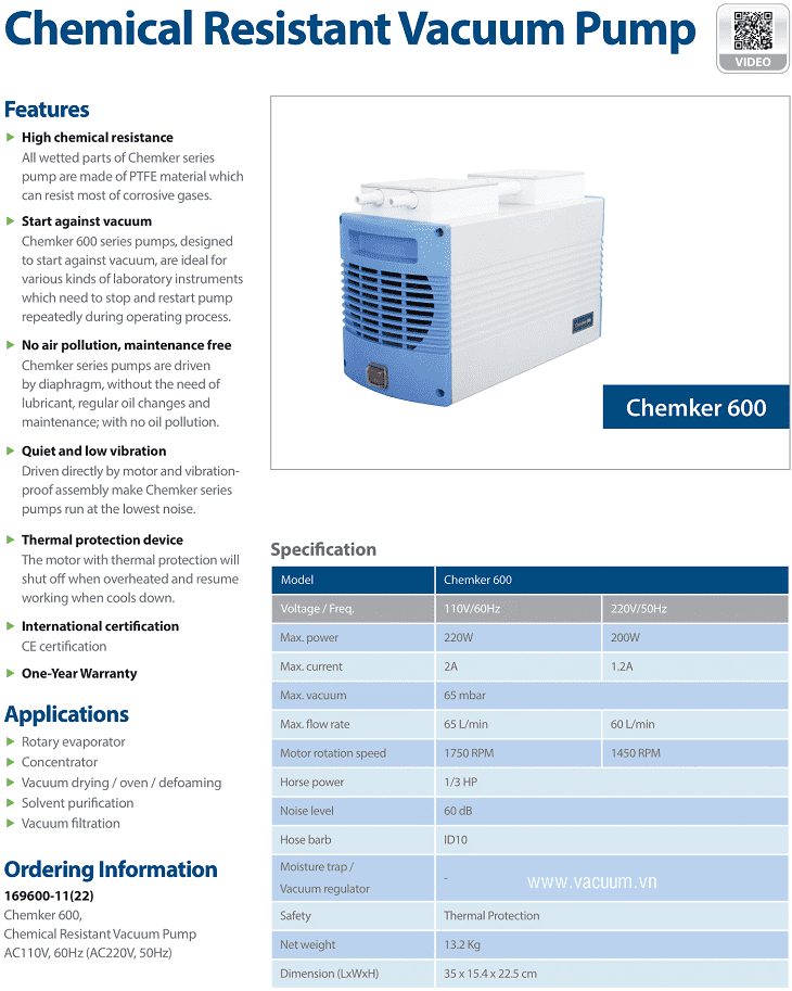 - Bơm chân không Rocker Chemker 600, Rocker oil free vacuum pump Chemker 600 thuộc dạng bơm hút chân không khô, không dầu (Dry oil free vacuum pump) có lưu lượng: 60 lít/phút (3.6 m3/h), độ chân không đạt 65 mbar chuyên dùng để hút chân không trong công nghiệp.